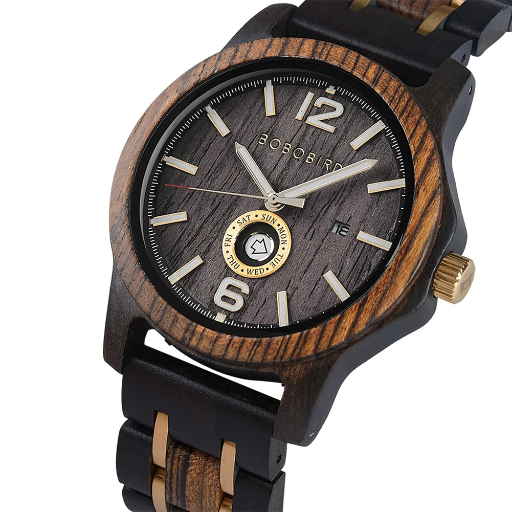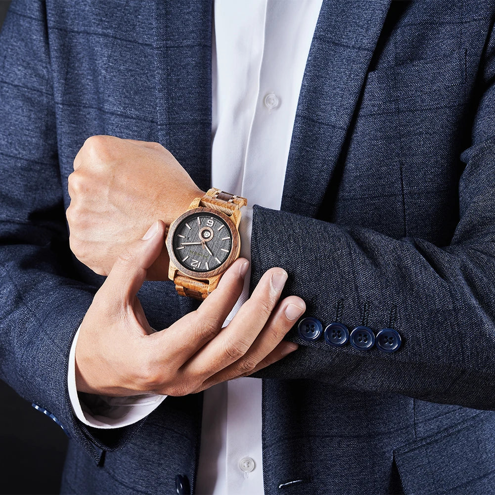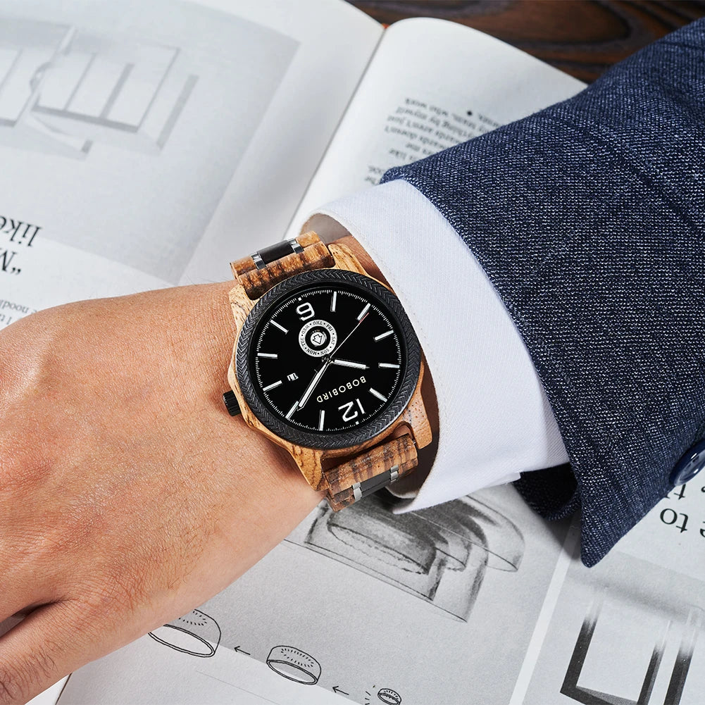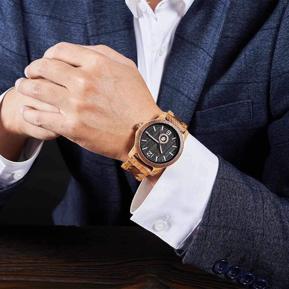 Sophisticated Design: The bold black dial contrasts beautifully with golden accents and natural wood textures, offering a refined yet stylish look suitable for both formal and casual wear.